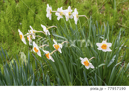 Daffodils with Mondragon Split Crown Narcissus poeticus blossoms in the garden in spring