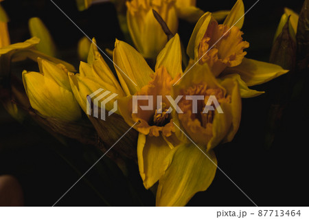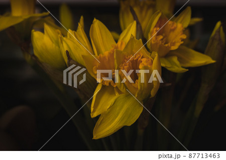 Yellow daffodils on a dark background close-up flowers. Floral dark aesthetic background.