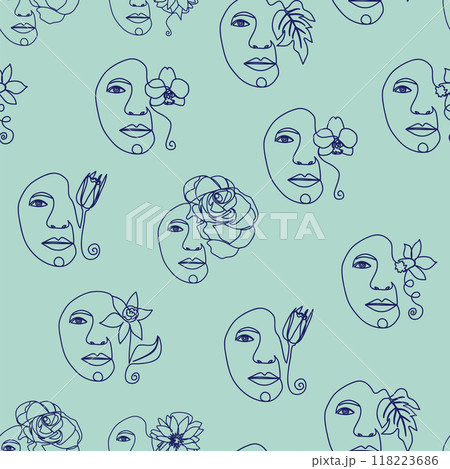 Outline woman face, abstract flowers leaves, line continuous drawing vector seamless pattern