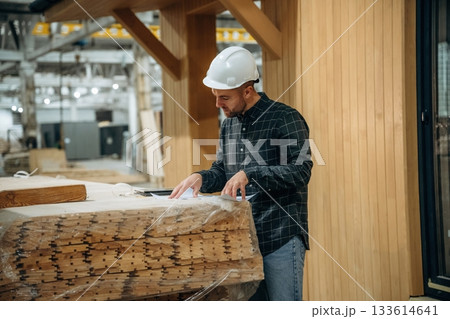 The wooden plank. Industrial worker in warehouse