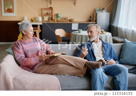 Portrait of happy senior couple relaxing at home together and chatting sitting on couch