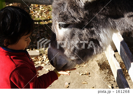 ヤギにえさやりをする子供の手 くろべ牧場 富山県