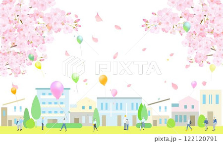 桜と風船ー可愛い街並みと人々の歩く風景ベクターイラスト春の背景素材