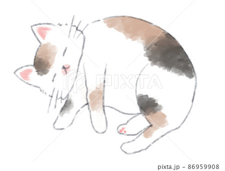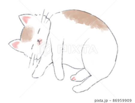 気持ちよさそうに横になって寝ている白地に茶色いブチの猫