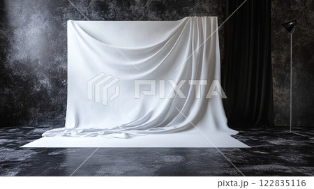 White curtain hangs in front of a black wall. The curtain is draped over a white wall, creating a sense of emptiness and loneliness. The black wall and white curtain create a stark contrast