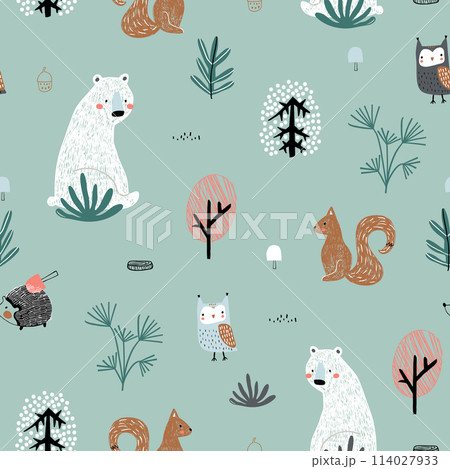 Seamless childish pattern with cute bear, squirrels, owl, hedgehog in the wood. Creative kids forest texture for fabric, wrapping, textile, wallpaper, apparel. Vector illustration