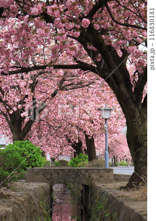 道路沿いに咲く八重桜