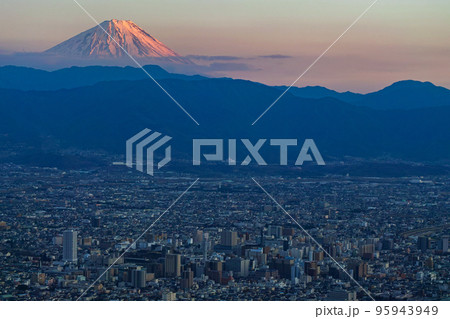 山梨県/ 紅富士と夕日に染まる甲府の街 夕景