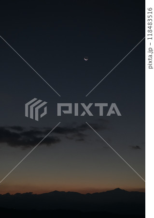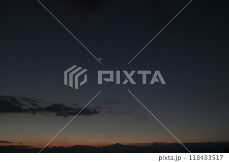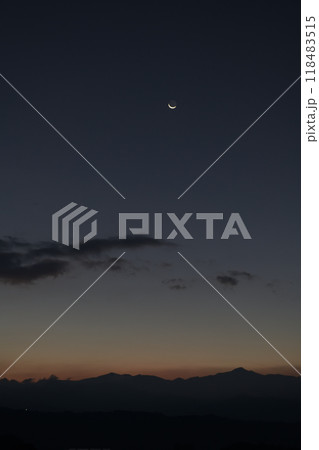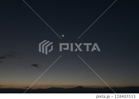北杜市白州町から見た夜明けの空に昇る細い月