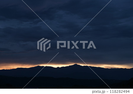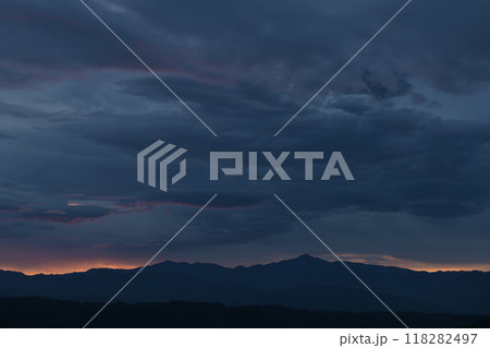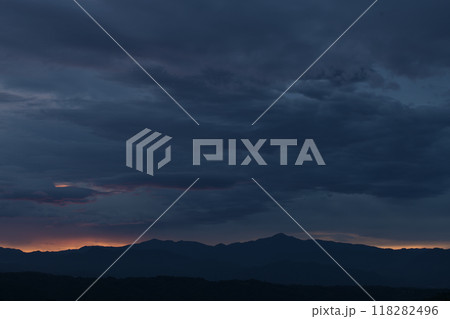 北杜市白州町から見た空を覆う雲の間から明けて行く奥秩父山塊金峰山