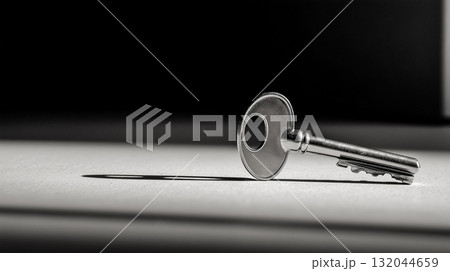 無機質な背景に横たわる鍵、抽象的コンセプトアート、静寂と可能性の交差点