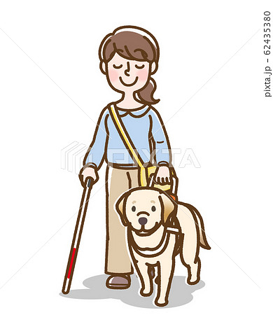 盲導犬 U字ハンドル 女性 白杖あり 背景あり