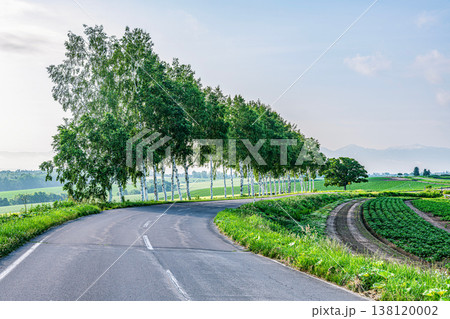 パッチワークの路とシラカバ並木(日本 北海道上川郡美瑛町)