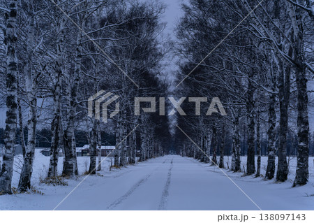 北海道美瑛町 夕暮れ時の白樺並木の丘