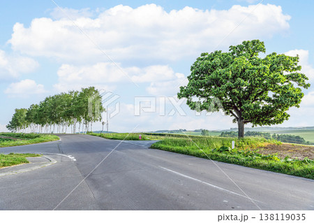 爽やかな夏の北海道美瑛町(白樺並木とセブンスターの木)