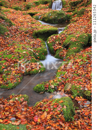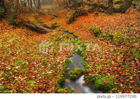 自然林の小川と苔と落ち葉