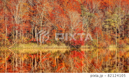 赤や黄色の紅葉に包まれた晩秋の信州蓮華白池