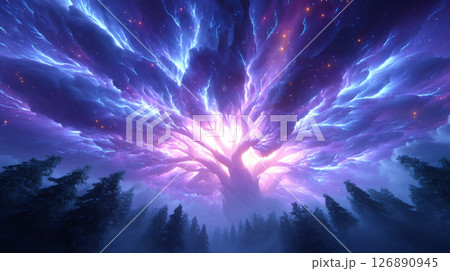 Mythical space tree with energy roots linking star systems and celestial clusters