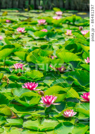 滋賀県草津市 水生植物公園みずの森の温室ロータス館の池に浮かぶ水蓮の花