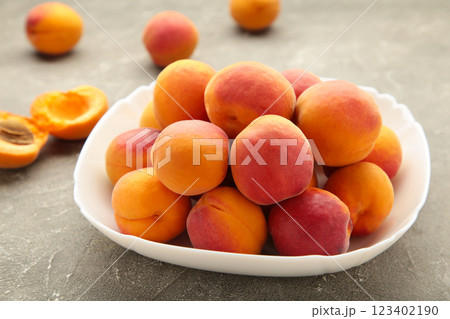 Fresh apricots in the bowl on grey concrete background