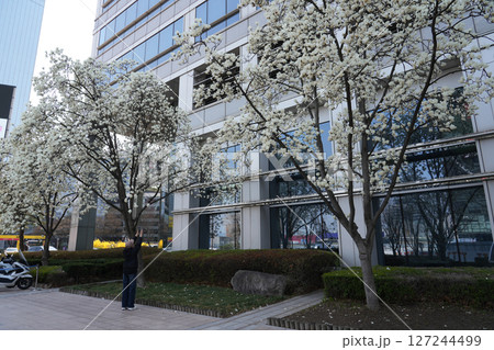 woman taking a photo of magnolia in early spring.