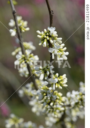 ハナズオウ 花開く枝先 白の背景 フィルム調