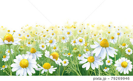 ハーブ、カモミール畑の水彩イラスト。シームレスボーダー。ナチュラルイメージのバナー背景。