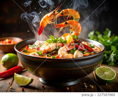 AI generated aromatic thai tom yum talay nam sai with fresh seafood ingredients falling into ornate thai bowl clear spicy lemongrass broth healthy herbs