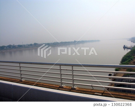 Hazy River View with Distant Trees and a Dock Seen Through a Bridge Railing