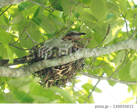 廃品利用の鳥の巣(巣で卵を温める雌のヒヨドリ)