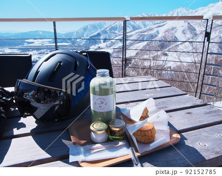 冬の白馬岩岳スノーフィールド 後立山連峰を背景に白馬ヒトトキノモリのイスとテーブル