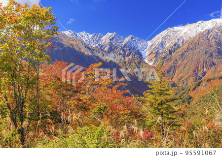 長野県北安曇郡白馬村北城岩岳 白馬岩岳マウンテンリゾートのヒトトキノモリから冠雪の白馬連峰と紅葉