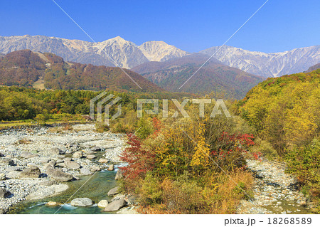 秋の白馬三山と松川(白馬大橋より)