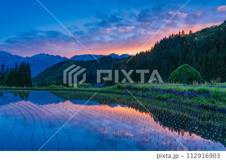 (長野県)白馬村 青鬼(あおに)集落の棚田と残雪の北アルプス 夕景