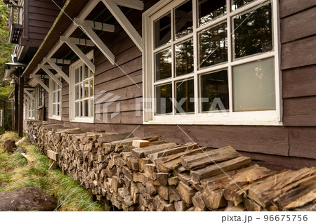 長野県 白駒池の湖畔に佇む山小屋の白駒荘 積み上げられた薪