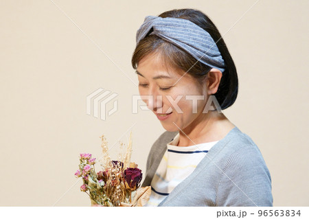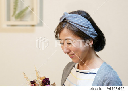 ドライフラワーを持った、クロスヘアバンドをした中年女性