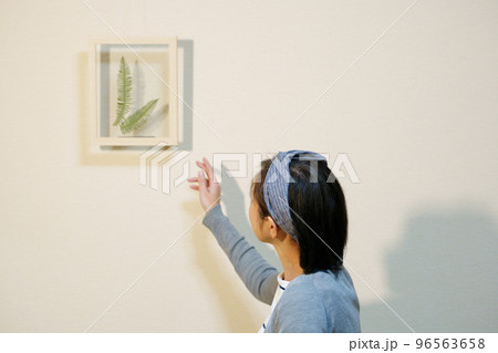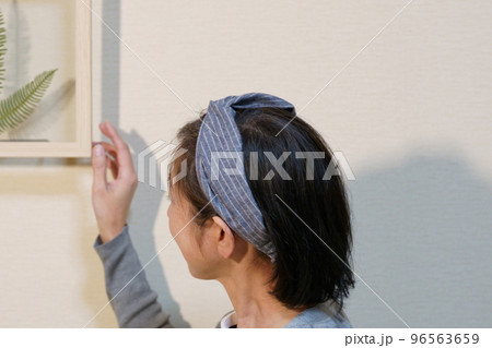ドライフラワーを飾るクロスヘアバンドをした中年女性