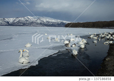 北海道・屈斜路湖の厳冬風景 白鳥が集う氷の湖岸(川湯)