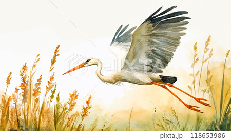 Stork Flying Low Over Reeds Watercolor Illustration For Childrens Book Graceful Stork In Flight Peaceful Wetland Scene Colorful Reeds Art Kids Storybook Serene Bird Illustration