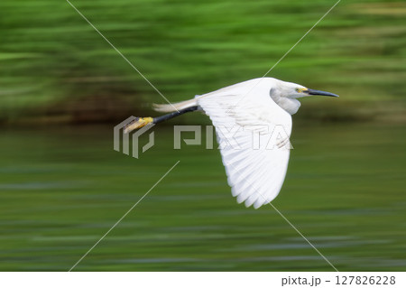 川の上を飛ぶコサギ、流し撮り