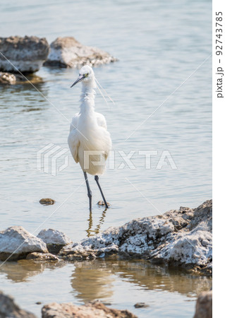 White heron wild sea bird, also known as great or snowy egret hunting on seaside in summer