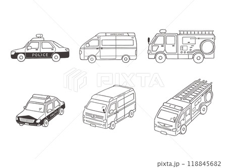 パトカー・救急車・消防車の手描きイラストセット(モノクロ)