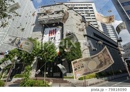東京日本橋兜町の東京証券取引所ビルの前で落下する大量の現金