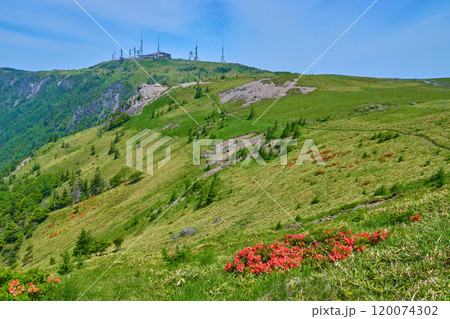 長野県松本市の美ヶ原の百曲り付近から北西側の王ヶ頭とアンテナ群を見る