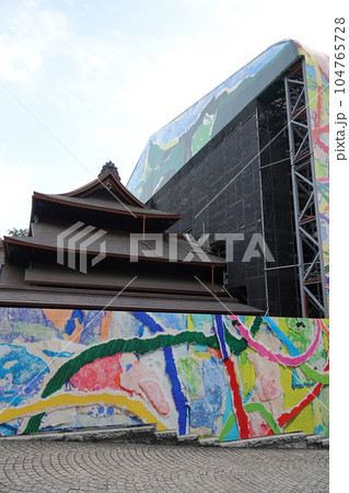リホーム中の道後温泉本館は重要文化財であり道後温泉を象徴する建築物である。