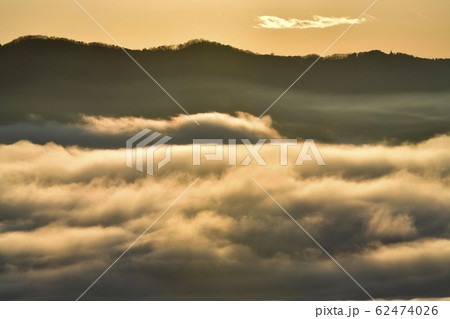 宝登山から朝焼けの長瀞にかかる雲海と東秩父の山々