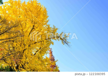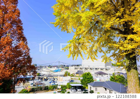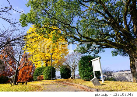 秋晴れ光芒に映えるイチョウの木と公園風景 木山城跡公園(益城町)