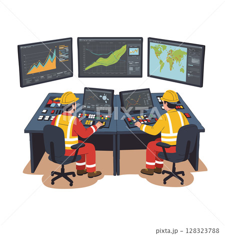Industrial Control Room Operators Monitoring Data and Charts on Screens Vector Illustration