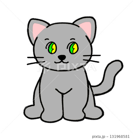 可愛い目がキラキラしたお座りしたグレー猫_全身
