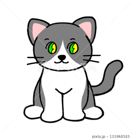 可愛い目がキラキラしたお座りしたハチワレ猫_全身